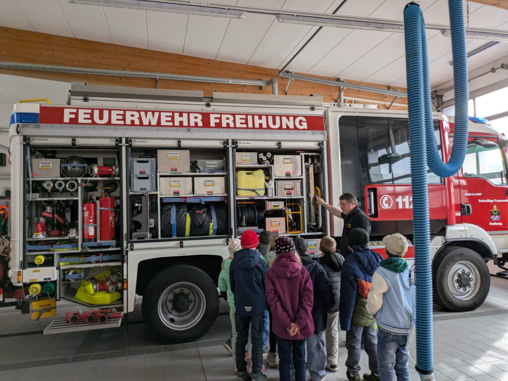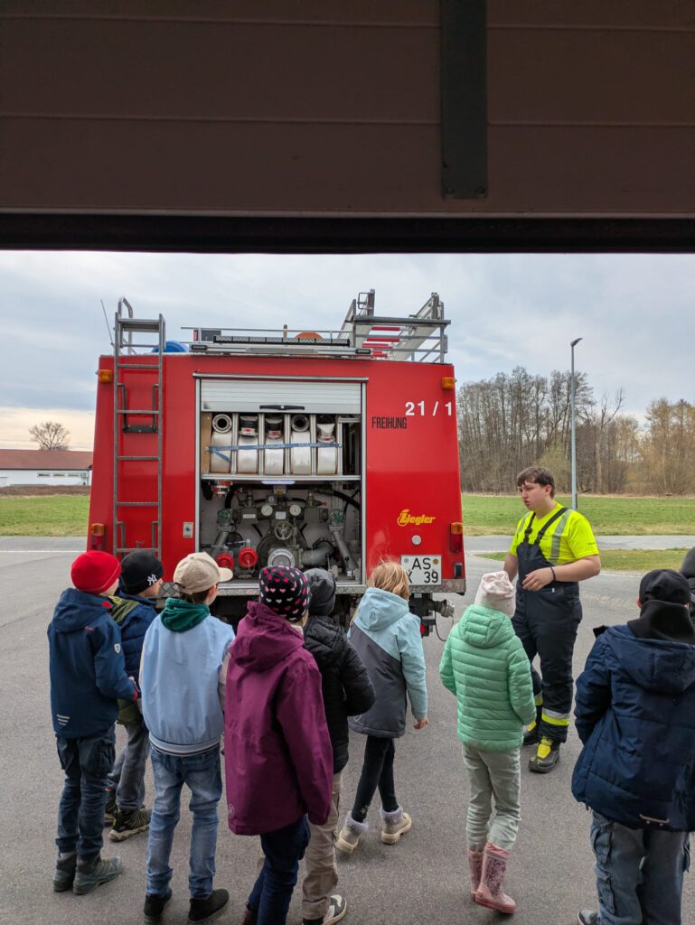 Vor Ort wurden die Kinder herzlich von den Feuerwehrleuten empfangen. Mit großer Begeisterung erfuhren sie, welche Aufgaben die Feuerwehr hat und wie ein Einsatz abläuft. Besonders beeindruckt waren die Schülerinnen und Schüler von den großen Einsatzfahrzeugen, die sie aus nächster Nähe bestaunen durften. Sogar ein Blick ins Innere der Fahrzeuge war möglich!