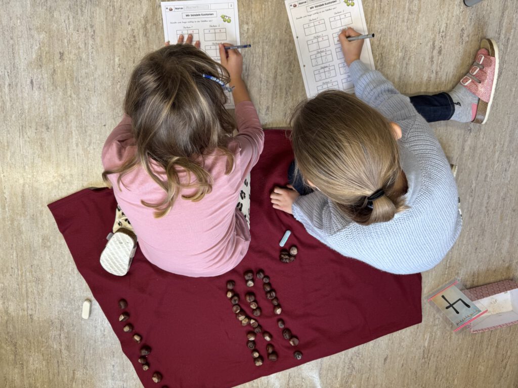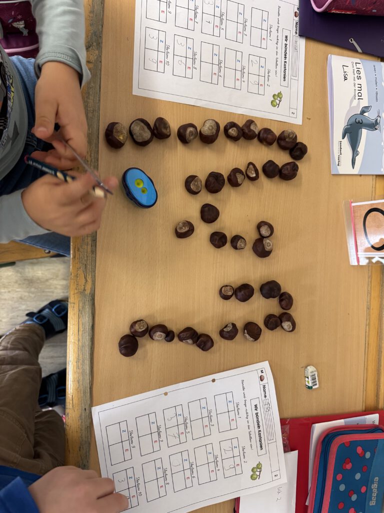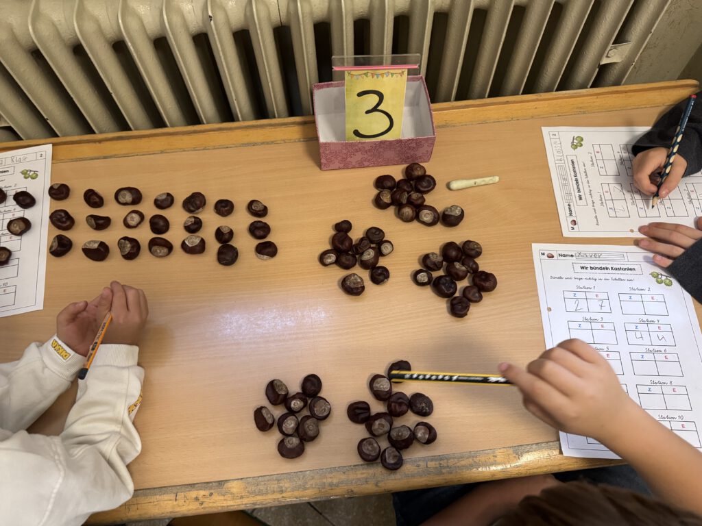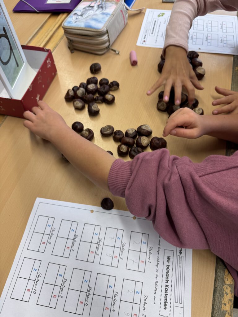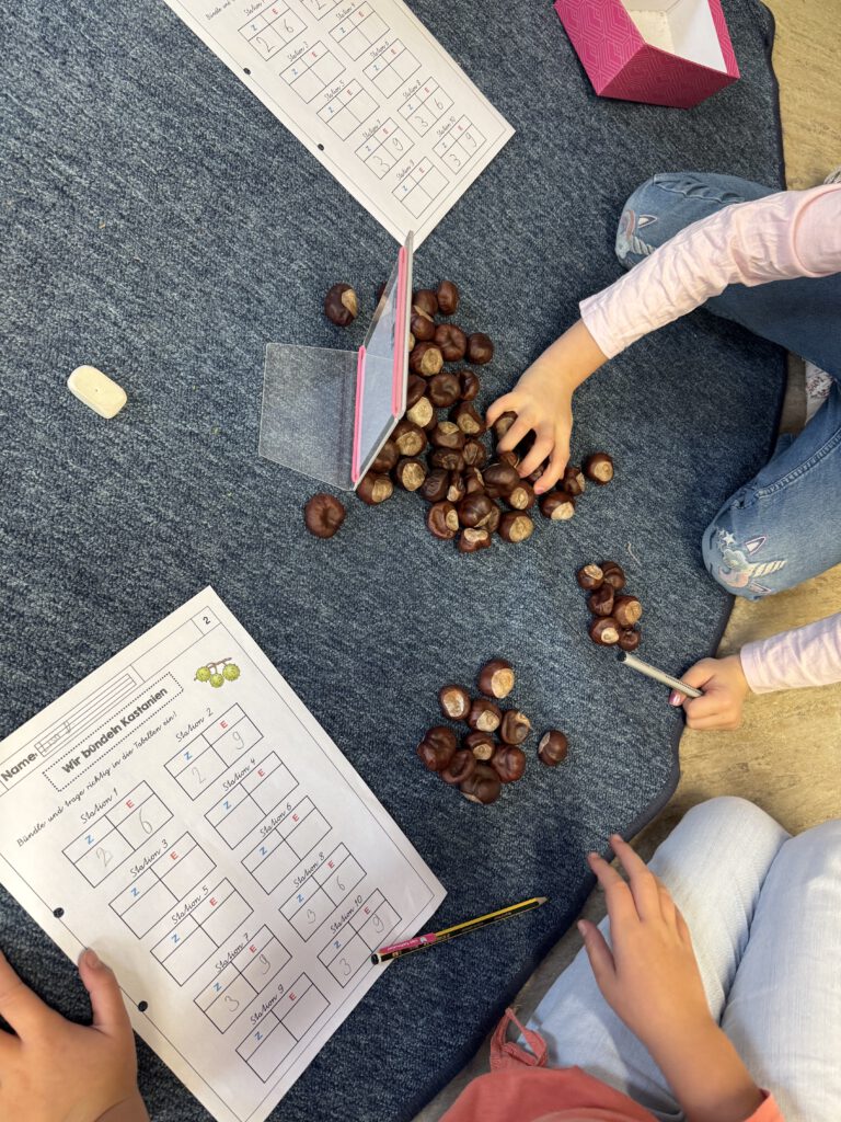 Nachdem der Räuberschatz sicher sortiert war, ging es an den nächsten „Naturschatz“: die Kastanien! An verschiedenen Stationen durften die Kinder Kastanien zählen, bündeln und stapeln. Ganz nebenbei wurde gerechnet, geschätzt und verglichen – und natürlich auch viel gelacht.