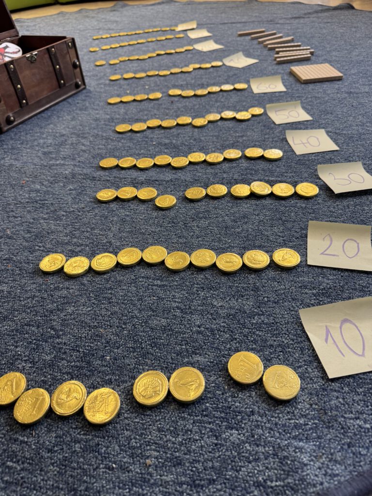 Mit viel Freude und Eifer wurden Goldmünzen gezählt, gebündelt und in Zehnerpäckchen gesammelt. So konnten die Kinder spielerisch entdecken, wie man Zahlen bis 100 übersichtlich darstellen kann.