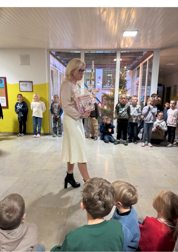 Für jede Klasse gab es einen großen Sack voller Nüsse, Schokolade und Mandarinen. Außerdem überraschte er die ganze Schule mit einem Gutschein für einen gemeinsamen Kinobesuch – die Freude darüber war riesig!