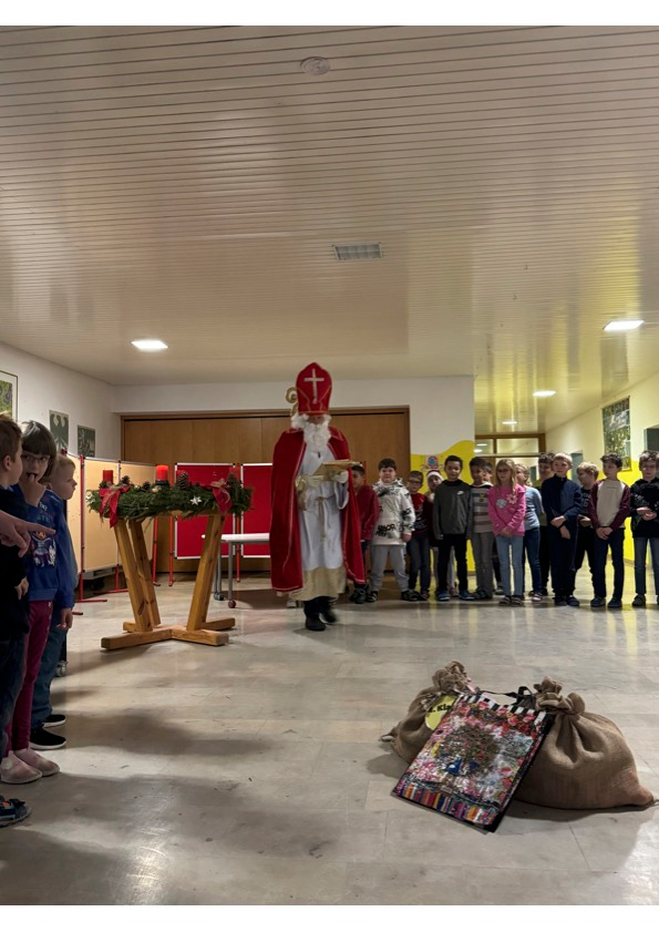 Der Nikolaus erzählte aus seinem goldenen Buch, in dem er für jede Klasse liebe Worte, Lob und ein paar Hinweise zum Weiterüben notiert hatte. Die Kinder lauschten aufmerksam und freuten sich sehr über den persönlichen Besuch.